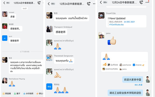两位授课教师丰富的专业积累、生动的示范讲解和干练的授课风采给泰国参训教师留下了深刻的印象,引发了课后学习交流群的热烈讨论,激发了他们投身新能源汽车技术专业建设的愿望和到中国、到必威西汉姆联官网继续交流学习的热情。