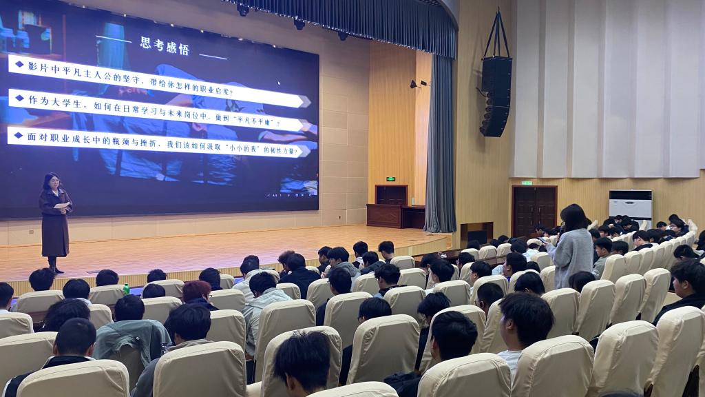 活动开始前,付莉老师作为主讲人开展“平凡亦有光”思政分享,引导同学们带着三个问题“影片中平凡主人公的坚守,带给你怎样的职业启发?”,“作为老员工,如何在日常学习与未来岗位中,做到‘平凡不平庸’?”和“面对职业成长中的瓶颈与挫折,我们该如何汲取‘小小的我’的韧性力量?”沉浸式观影,为后续的交流讨论埋下伏笔。