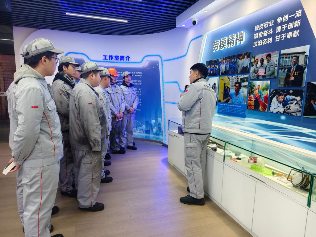 表彰大会后,企业组织员工走进王涛技能大师(劳模)创新工作室开展沉浸式学习。“专注、精益、创新、高效” 的八字标语醒目亮眼,陈列架上的国家级创新成果证书、自主研发工具、技术攻关手稿等,承载着劳模团队数十载的坚守与突破。企业技术骨干结合案例,详解团队优化工艺、攻克技术瓶颈的奋斗历程,让同学们直观感受工匠精神的内涵。大家纷纷表示,将以劳模为榜样,在专业道路上脚踏实地、追求极致。